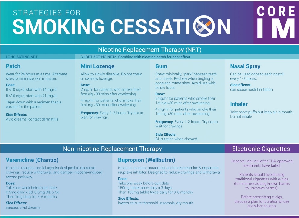 약물요법으로 위의 두 약물 외에 니코틴대체요법(NRT)으로 니코틴패치, 니코틴 사탕, 니코틴 껌 등이 있으며