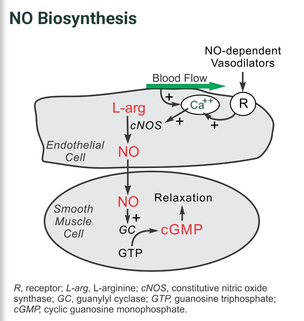 이 산화질소(NO)가 혈관 평활근의 이완을 일으키는 일련의 과정을 거쳐 혈관확장을 나타냅니다.