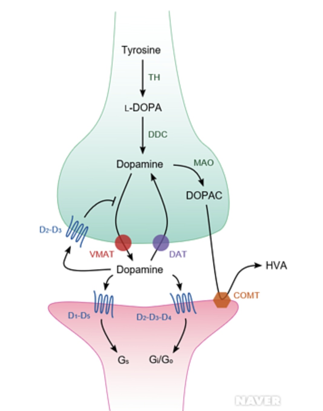 작용에서 보상센터로서의 역할을 합니다. 뇌의 신경조직에서 생성되는 카테콜라민(에피네프린, 노르에피네프린, 도파민)의 약 80%를 구성합니다. 도파민의 많고 적음에 의해 파킨슨병, 하지불안 증후군, 주의력결핍 과잉행동증후군(ADHD)등
