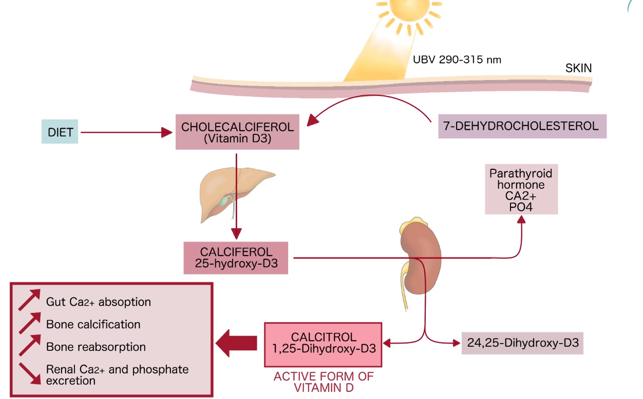 비타민D는 뼈의 적절한 형성과 부갑상선호르몬, 인산염, 칼시토닌과 연관되어 혈청칼슘의 항상성유지에