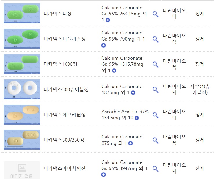 디카맥스1000정(Ca 500mg Vit.D 1000IU),디카맥스500츄어블정 (Ca 750mg,Vit.D 500IU)으로