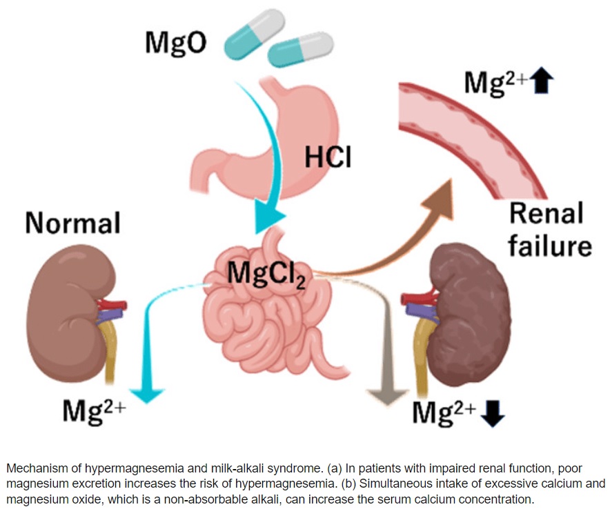 주로 신장에서 소변으로 배설되므로 신부전환자에서 장기간 섭취 시 고마그네슘혈증의 위험이 있습니다.