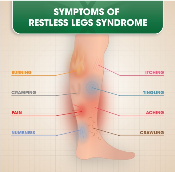 하지불안증후군(RLS, restless legs syndrome)은 특히 밤에 앉거나 누울 때 다리에 근질거리는 이상감각과