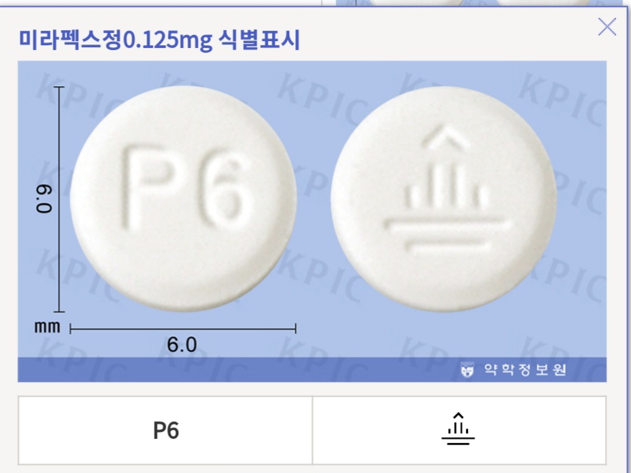 미라펙스는 일반정제 0.125,0.25,0.5,1mg과 서방정 0.375,0.75,1.5mg 등