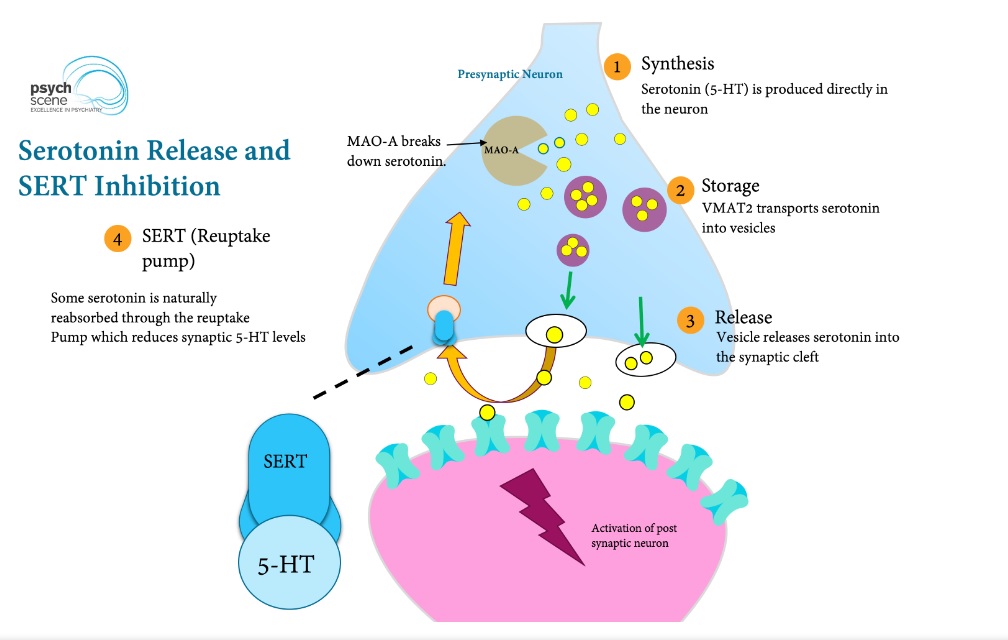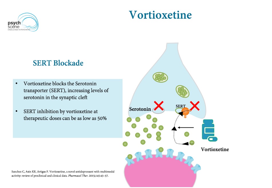 vortioxetine은 SERT에 대한 친화력이 높으며 SERT차단은 시냅스간극에서 세로토닌농도를