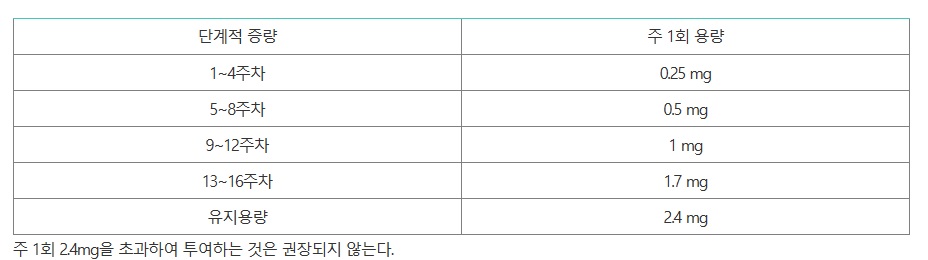 시작용량으로 주 1회 2.5mg 피하주사하며 4주 이후 5mg으로 증량합니다.
