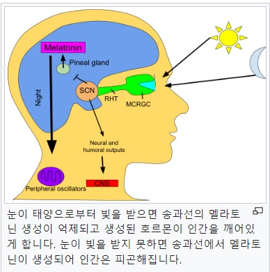 멜라토닌은 어둠에 반응해서 뇌에서 생산되는 호르몬으로 24시간 생체리듬과