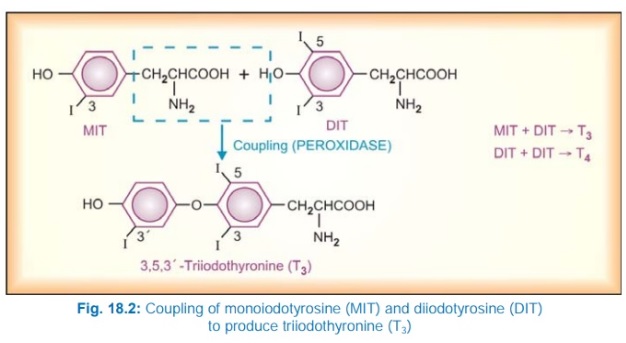 요오드화된 티로신 잔기인 MIT(monoiodotyrosine)과 DIT가 결합하여 T3를, DIT 두 분자는 결합하여 T4를 형성합니다.