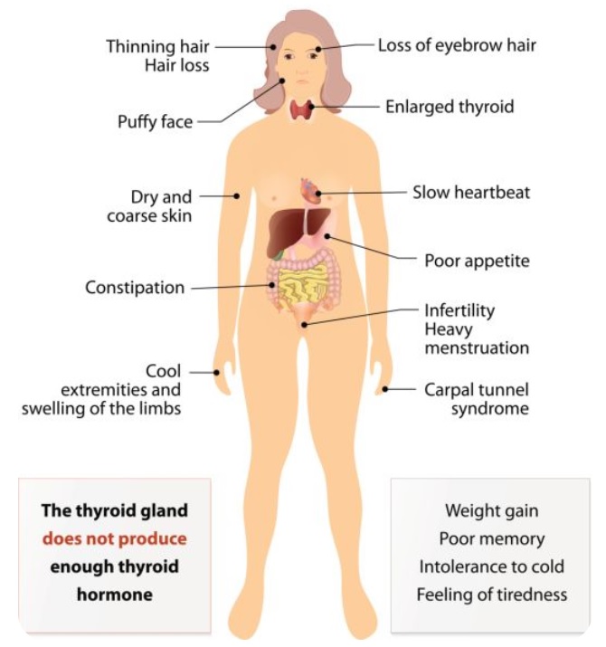 추위에 민감, 변비, 피부건조, 체중증가, 쉰 목소리, 거친 피부, 머리카락, 근육약화, 근육통, 느린 심박수, 우울증,
