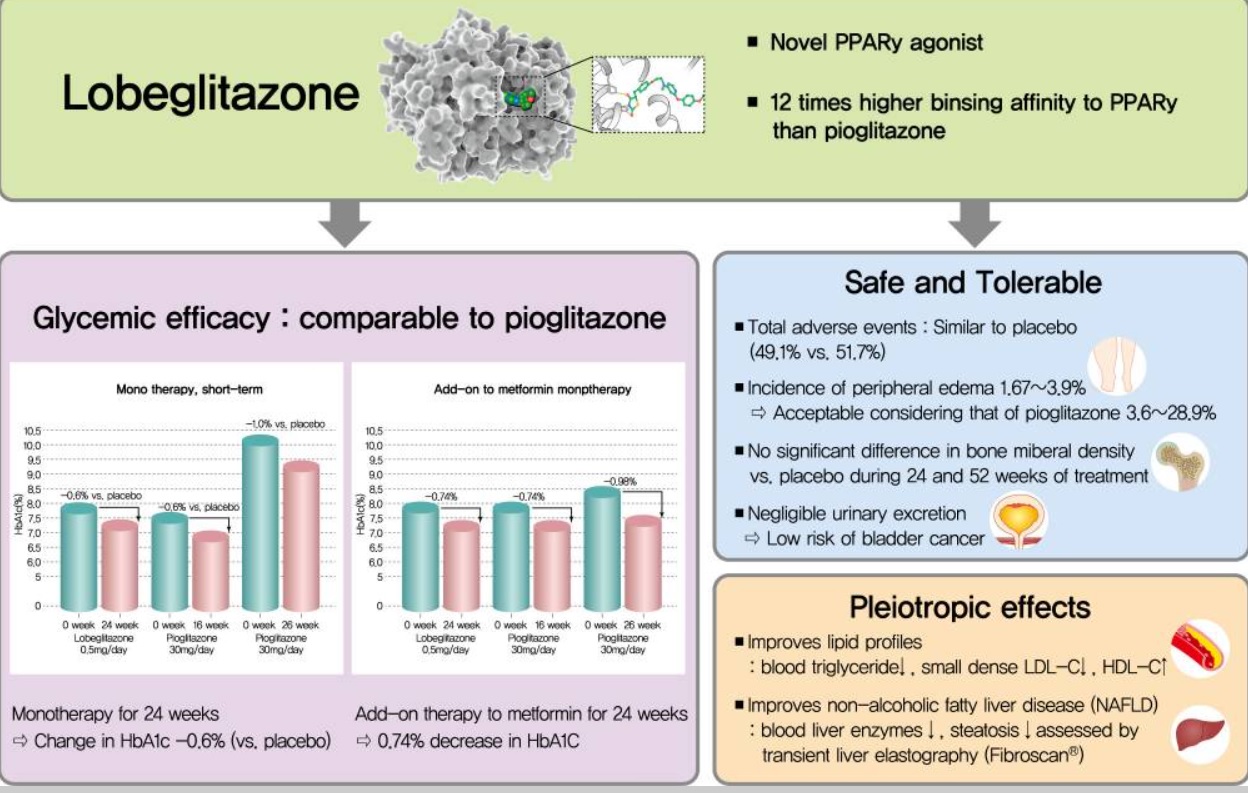 PPAR 감마와 알파 수용체에 모두 작용하여 혈당 강하와 함께 지질저하 효과가 있습니다.