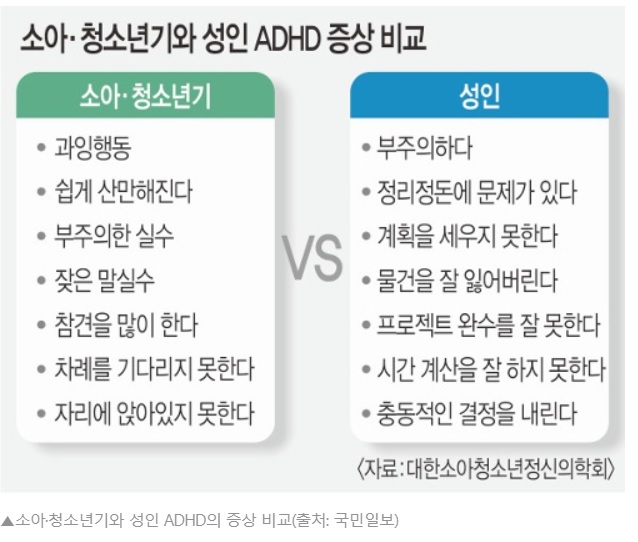 성인 ADHD환자는 충동적 성향, 자제력 부족, 주의력 산만, 인간관계 장애, 참견을 많이 하고 시간계산이 어렵고