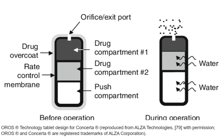 OROS(osmotically controlled release oral-delivery system) 제형은 두 가지 다른 농도의 메틸페니데이트와